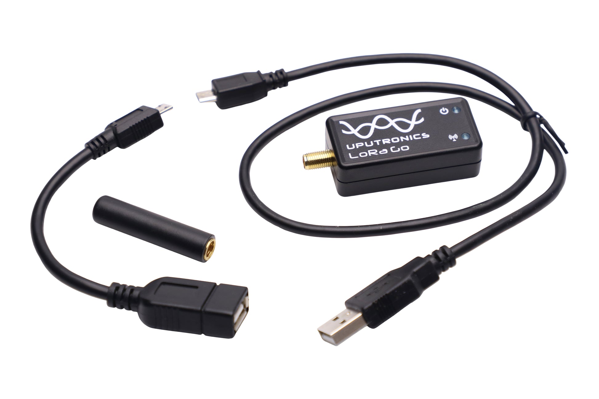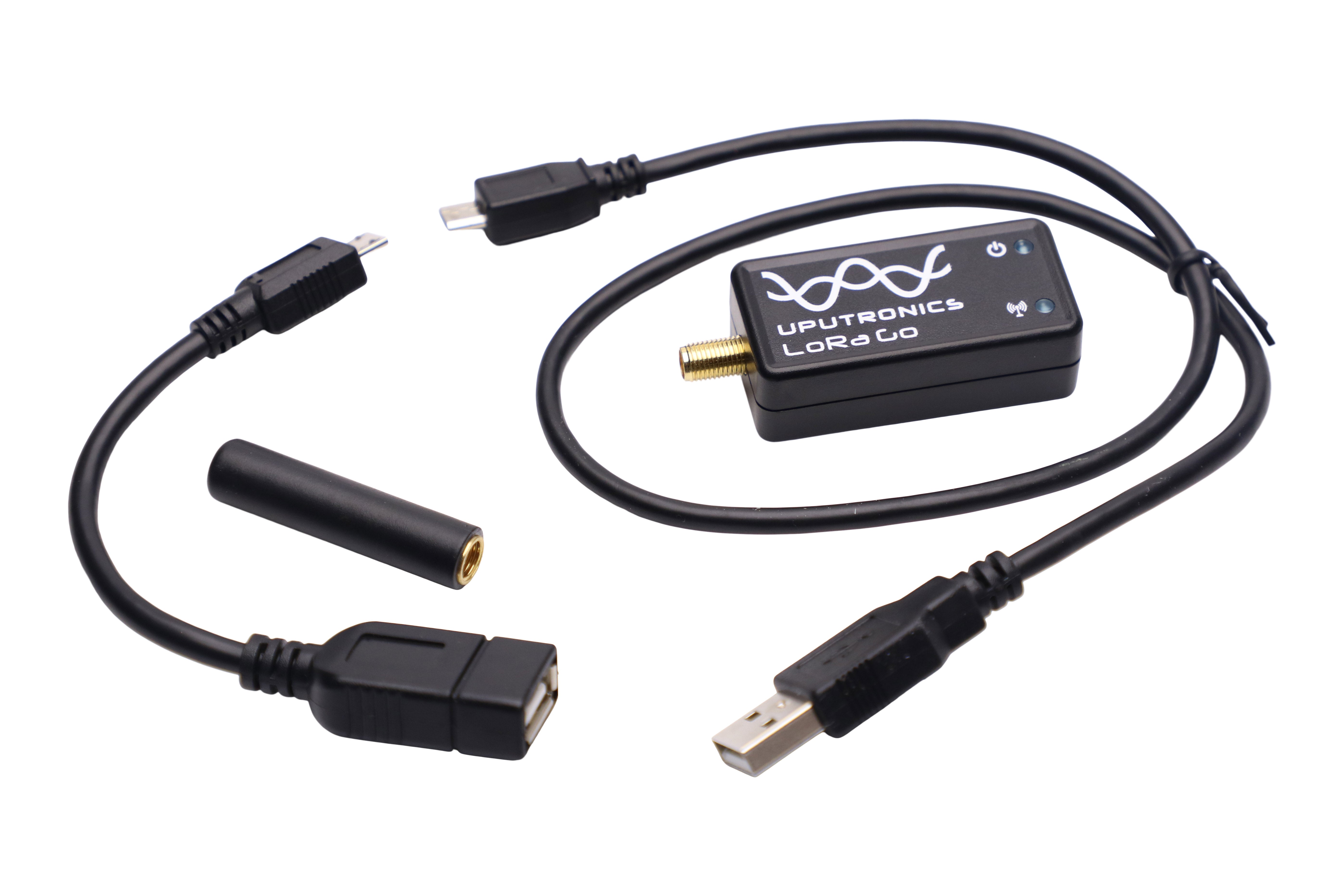 Supplied with matching stubby antenna, microUSB OTG adaptor and a Micro to USB-A cable.